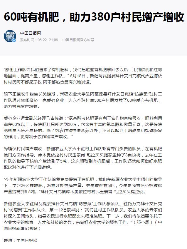 “感谢工作队给我们送来了有机肥料,我们把这些有机肥拿回去以后,用到核桃和红枣地里面,提高产量,感谢工作队。”6月18日,新疆阿瓦提县拜什艾日克镇代热亚博依村村民阿不都尼牙孜·阿不都热合曼高兴地说道。