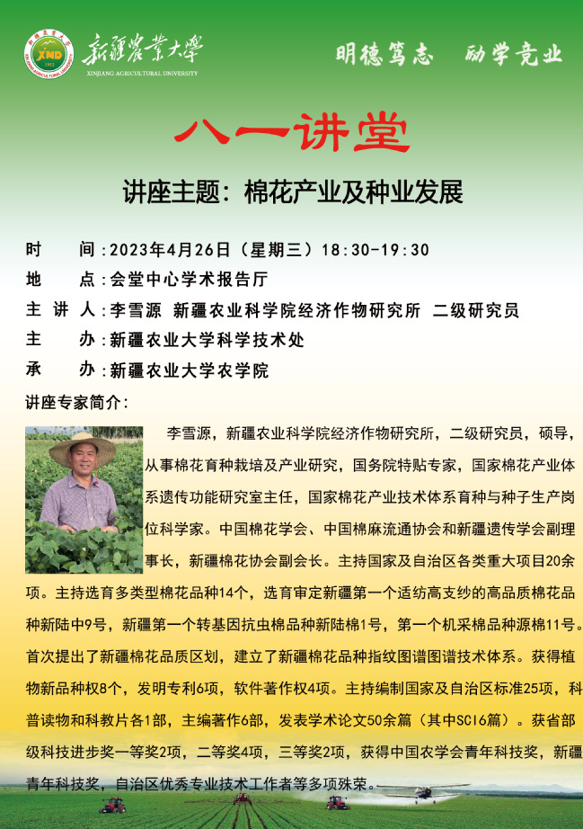 【八一讲堂预告】第二十五期:棉花产业及种业发展