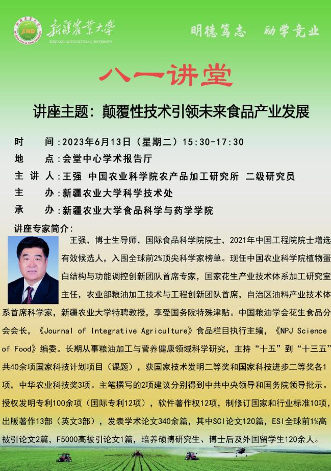 【八一讲堂预告】第三十期:颠覆性技术引领未来食品产业发展