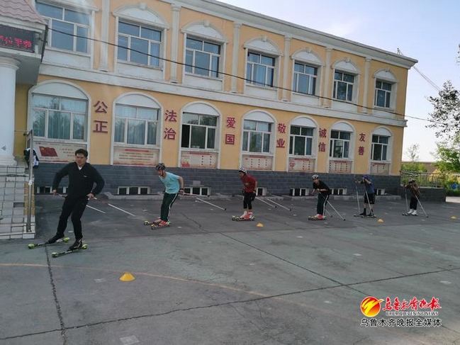 9月8日,乌鲁木齐市萨尔达坂学校的越野滑雪滑轮课上,在哈孜热提·朱玛别克的指令中,二十几名学生开始慢跑、拉伸,做上肢力量练习、下肢力量练习、核心练习……