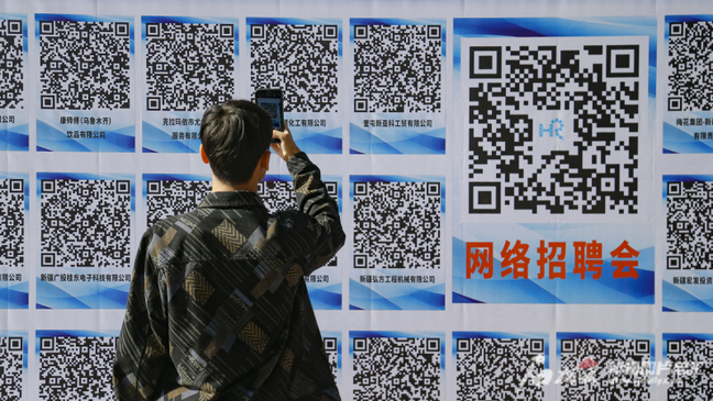 10月14日,学生在校园招聘会上扫码了解企业情况。
