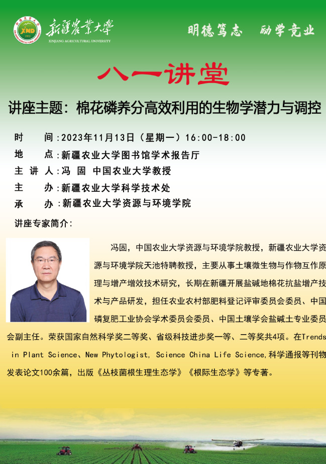 【八一讲堂预告】第四十四期:棉花磷养分高效利用的生物学潜力与调控