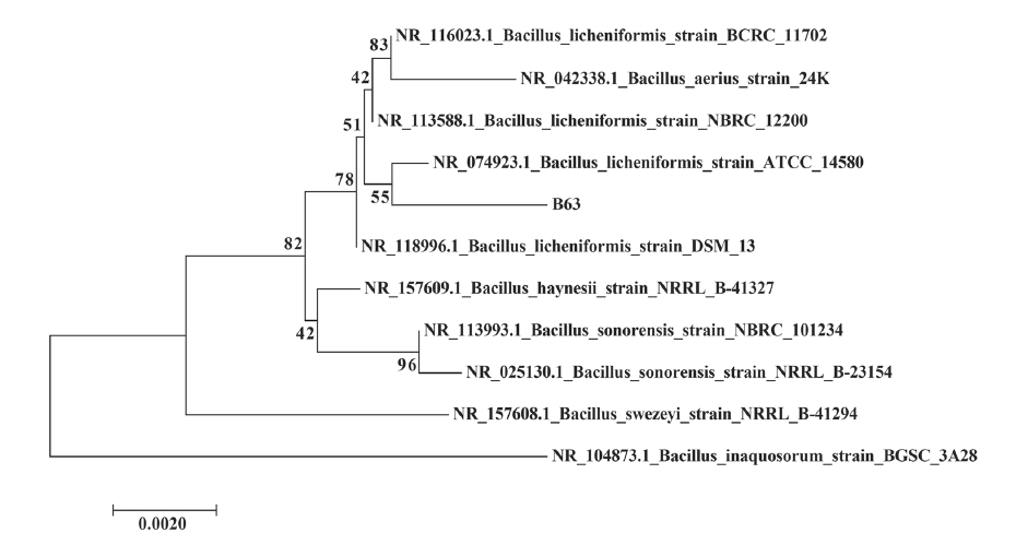 图1 地衣芽孢杆菌B63系统发育进化树  | ||