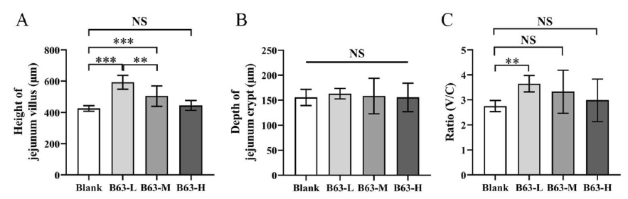 图2 地衣芽孢杆菌B63促进小鼠日增重  | 图3 地衣芽孢杆菌B63促进SD大鼠肠道结构发育  | |