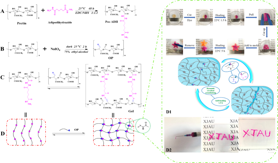 图1 全果胶基可注射水凝胶药物递送系统的制备、自修复以及可注射性能:(A-D)可注射水凝胶的制备及动态修复示意图;(D1)宏观自修复实验及机理;(D2)宏观可注射性实验。