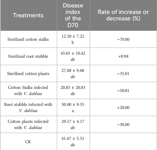 表2 带菌棉秆和根茬直接还田对棉花黄萎病病情指数增减率的影响