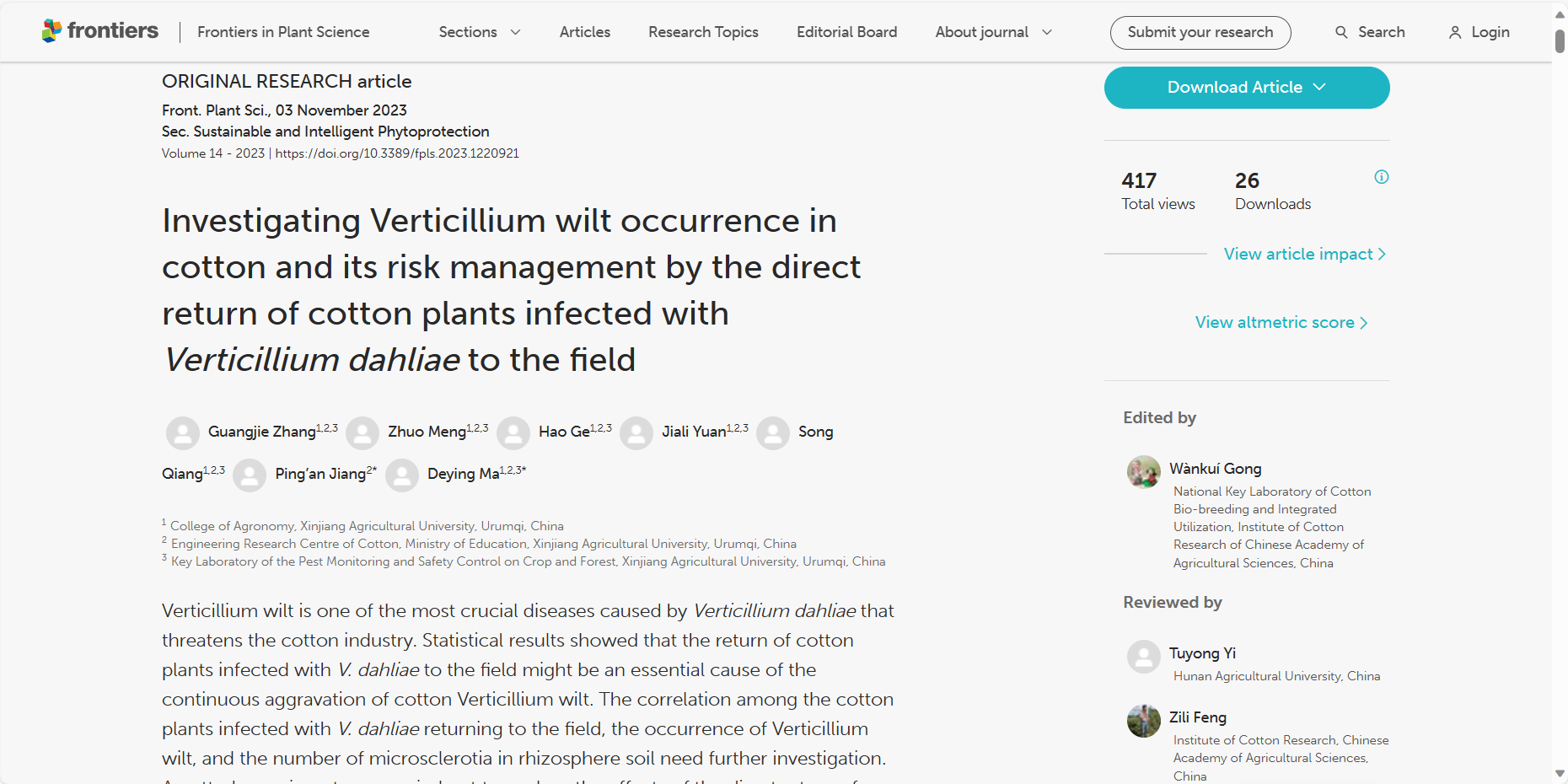 近日,国际知名期刊Frontiers in Plant Science在线发表了安博网页版教育部棉花工程研究中心的研究论文“Investigating Verticillium wilt occurrence in cotton and its risk management by the direct return of cotton plants infected with Verticillium dahliae to the field”。