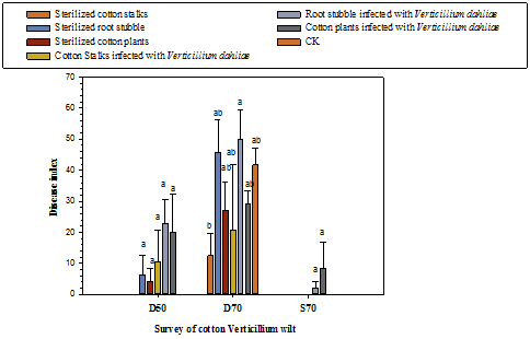 表3 带菌棉秆和根茬直接还田对根际土壤中棉花黄萎病带菌量的影响(BS70:第70天病田土棉花根际土样;MS70:第70天灭菌土棉花根际土样)