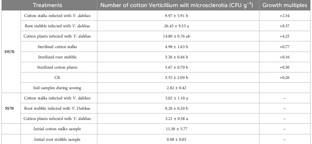 本研究表明,带菌棉秆和根茬直接还田加重了当年棉花黄萎病发生的风险和程度,病田土根际土壤中棉花黄萎病微菌核的数量在黄萎病发生的高峰期相较于初始土样增长0.16~8.37倍,棉花黄萎病发生的病情指数与根际土壤微菌核数量有正相关趋势。带菌根茬还田对棉花黄萎病的发生负面影响最大,病情指数加重20.00%,土壤微菌核数量增长8.37倍。