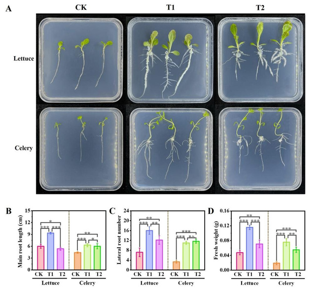 图1 滋养节杆菌(Arthrobacter pascens)BUAYN-122(T1)和枯草芽孢杆菌(Bacillus subtilis)BUABN-01(T2)对生菜和芹菜幼苗的促生长活性。所有数据均以平均值±标准差(n=6)表示。数据采用单因素方差分析。根据Tukey’ s post-hoc检验(显著性水平:n.s.=不显著;*:0.01 ≤ P < 0.05;**:0.001 ≤ P < 0.01;***:P < 0.001)