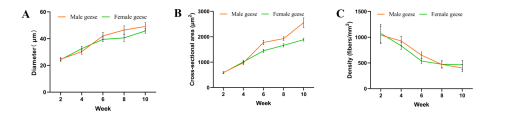 研究团队对2、4、6、8和10周龄伊犁鹅的腿部肌肉组织学特性及腿肌mRNA表达谱进行比较分析,筛选与伊犁鹅肌肉发育相关的差异表达基因,通过生物信息学预测差异基因潜在的生物学功能。研究发现伊犁鹅腿肌肌纤维直径和密度随周龄的增加而增加,公鹅在4-6周龄时肌纤维直径和横截面积增长最快,肌纤维密度在4-8周龄迅速下降,母鹅在2-6周龄时肌纤维直径和横截面积增长最快,密度迅速减小,6周龄之后肌纤维增长速度逐渐下降。同时,研究筛选出4个(ITGB3、ITGB6、ACTB和LAMA4)与鹅肌纤维的早期生长发育相关的重要调控基因以及TGF-β signaling pathway和MAPK signaling pathway等调控通路,为进一步研究鹅肌肉生长发育分子机制提供了基础。
