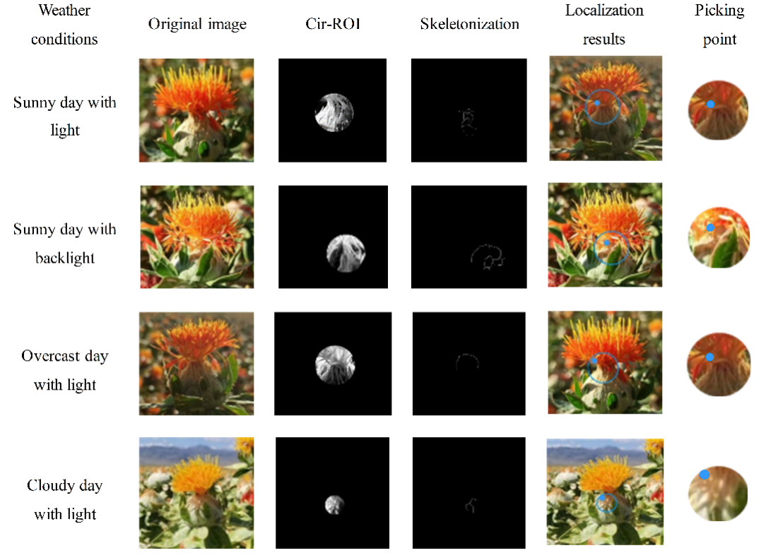 该研究选取4种天气条件下的400幅独立验证红花采摘点定位过程(图3),并计算出4种不同天气条件下试验图像的质心、采摘点像素坐标、最优采摘点所在位置,计算采摘点与最优采摘点之间的误差(表1)。试验结果表明,该研究方法在晴天逆光下求得采摘点/像素与最优采摘点之间无误差,其定位准确率略优于顺光,原因在于光照条件的变化,逆光作用在红花图像上改善了光照强度和亮度,削弱了强光带来的背景色差重叠,更有益于采摘点定位。然而,晴天顺光条件下求得采摘点与最优采摘点之间的误差比晴天逆光条件下多4个像素。顺光作用在红花图像上提高了光照强度和亮度,但是红花的花丝本身与周围的复杂环境相融合,尤其是其他红花丝等,从而导致定位红花的色差与周围背景相同。此外,红花图像提取不完整导致红花丝质心计算误差太大,进而使采摘点定位出现偏差。