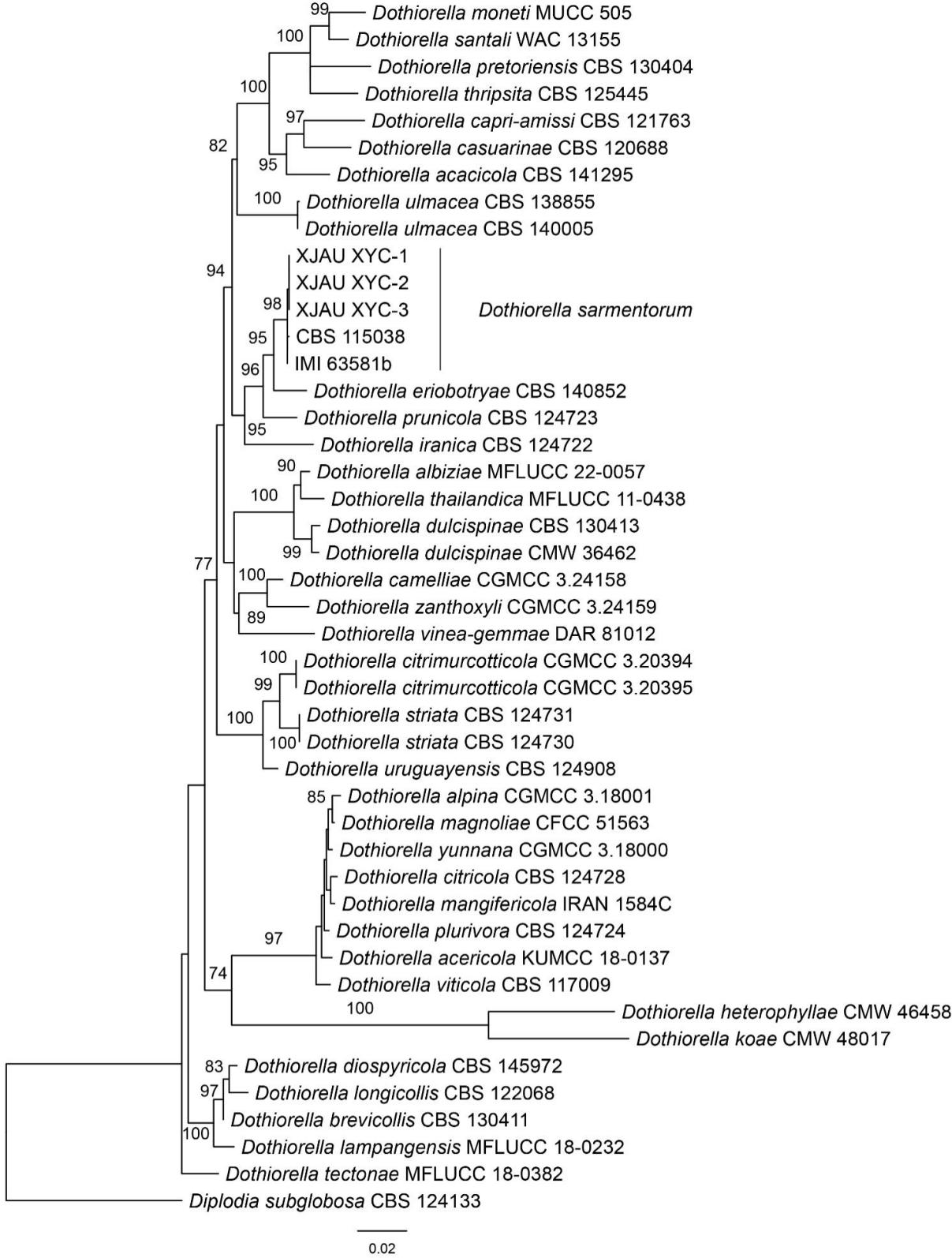 苏秀娟团队在新疆伊犁州的伊宁县“恬雅粉色”品种的薰衣草上采集到病害标本,马荣团队通过常规组织分离法和单孢培养法获得菌株XIAU XYC-1,依据柯赫氏法则验证了该菌株为“恬雅粉色”叶枯病的致病菌。基于形态学特征(图1)联合多基因片段构建的系统发育树(图2)综合分析后明确了“恬雅粉色”品种的薰衣草叶枯病的致病菌为Dothiorella sarmentorum。