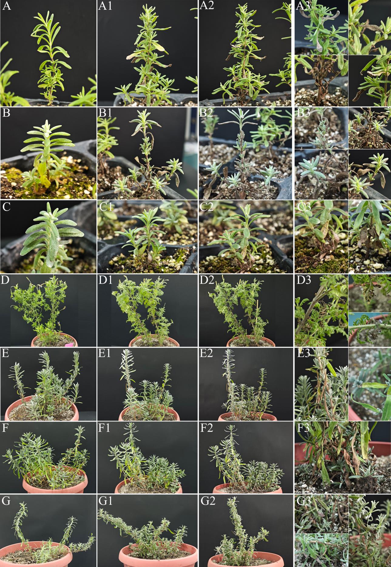A-G的薰衣草品种依次为“恬雅粉色”、“优天蓝”、“健雅”、“西班牙之眼”、“法国蓝”、“太空蓝”和“清雅蓝”;A-G为 对照组;A1-G1是将致病菌Dothiorella sarmentorum孢子悬浮液接种于薰衣草上3d的症状;A2-G2:接种15d的症状;A3-G3:接种15d的危害部位的局部