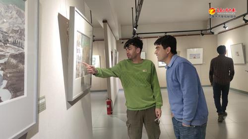 同样学美术专业的埃曼则在画家马宏彦的系列作品《帕米尔雄鹰》前细细欣赏,听马宏彦解读作品故事——英雄楷模拉齐尼·巴依卡是一位护边员,为救落水儿童英勇牺牲。她眼中含泪,“在每一幅作品里我都看到了故事,感受人类崇高的情感。”