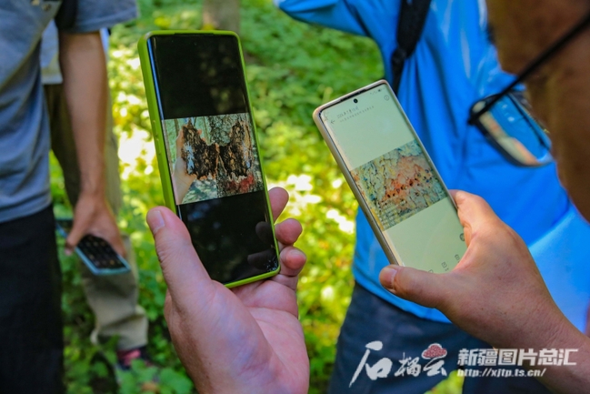 8月4日,大学生在自治区天山东部国有林管理局吉木萨尔分局辖区松林内通过手机图片对比病虫害发展情况。
