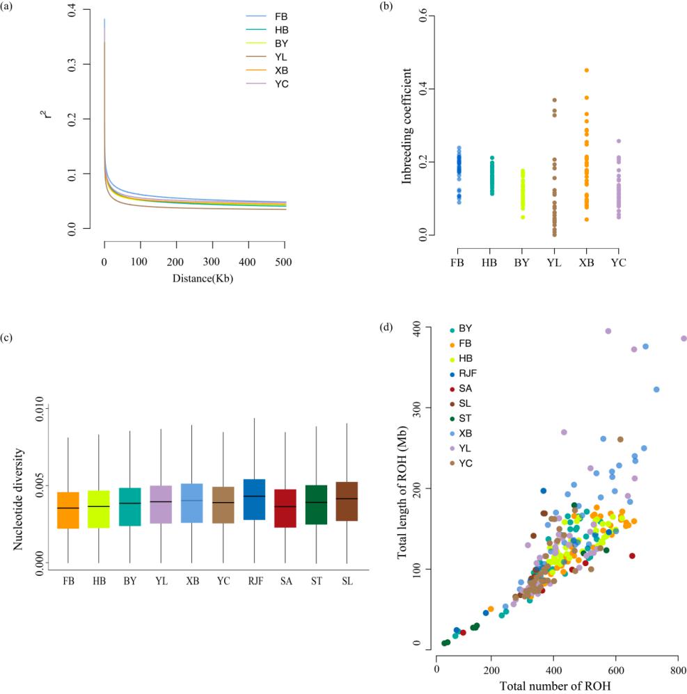 图3. 不同鸡群体间的遗传多样性。(A)每个群体连锁不平衡分析;(B)不同鸡群体每个个体的近亲繁殖系数;(C)每个群体核苷酸多样性分析;(D)估计每个群体ROH的总数。