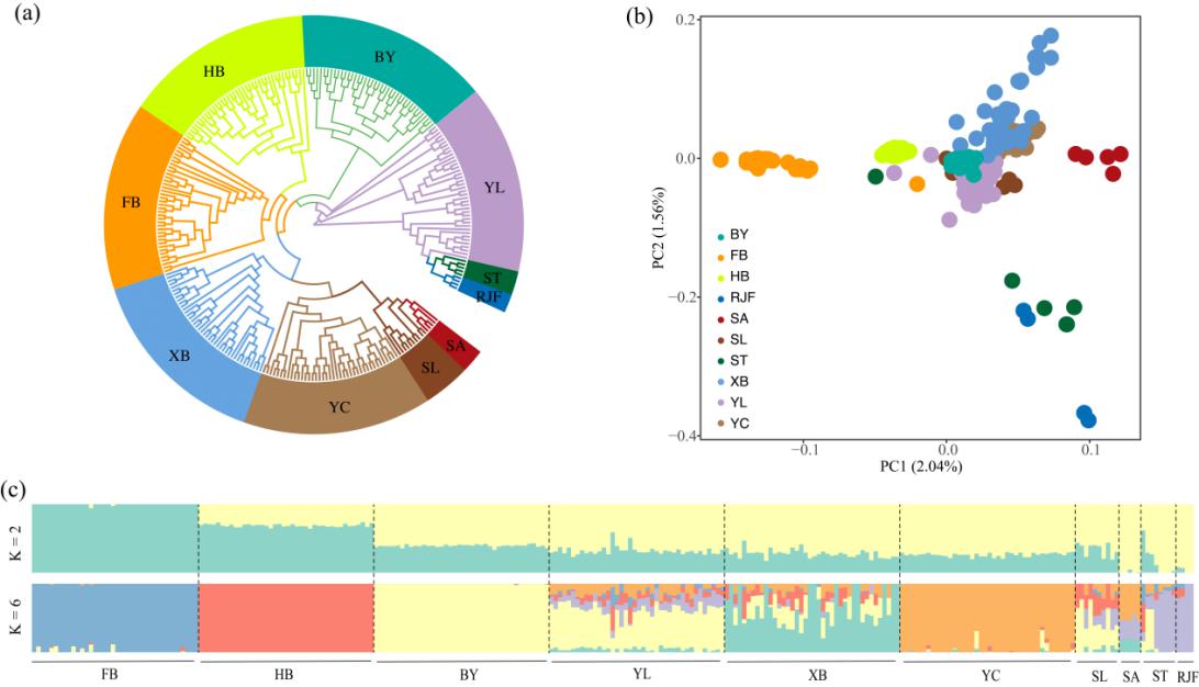 图2. 十个鸡品种的群体遗传学分析。(A)邻接树分析;(B)主成分分析;(C)群体遗传结构分析。