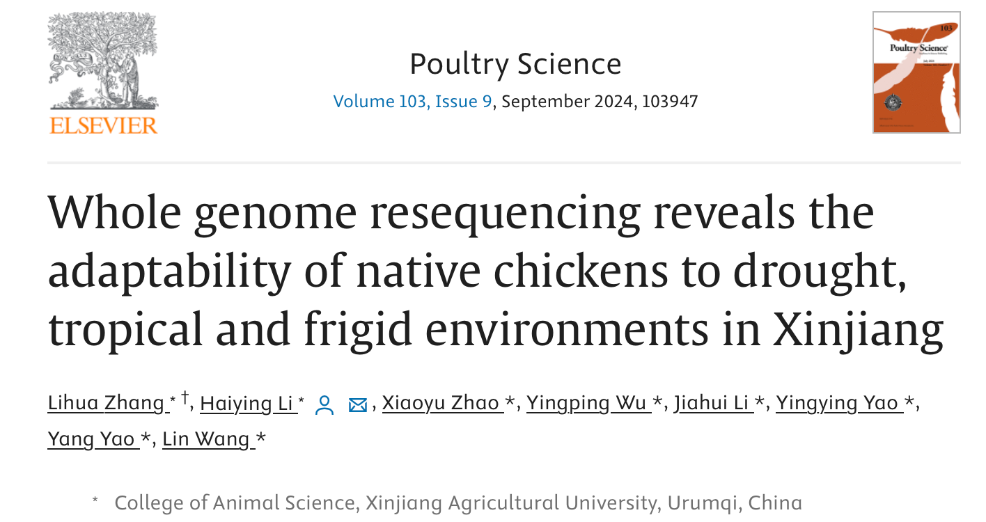 近日,安博网页版动物科学学院李海英教授团队在Poultry Science 发表了题为Whole genome resequencing reveals the adaptability of native chickens to drought, tropical and frigid environments in Xinjiang的研究论文。该论文对新疆6个地方鸡种(也迷里鸡、伊犁鸡、小宛黑鸡、拜城油鸡、和田黑鸡和富蕴黑鸡)240个个体进行了全基因重测序,比较极端环境下和对照环境下(例如,热带和寒冷;干旱和湿润)的样本的基因组,发现了一系列与地方鸡极端环境适应性相关的新的候选基因,以及相应的GO功能类别和信号通路。例如:CORO2A、CTNNA3、AGMO、GRID2、BBOX1、COL3A1、INSR、SOX5、MAP2和PLPPR1等候选基因与地方鸡对炎热、寒冷和干旱环境的适应相关,溶酶体、半胱氨酸和蛋氨酸代谢、糖胺多聚糖降解和Wnt信号转导等途径可能在调节鸡对干旱环境的适应中发挥重要作用。本研究结果有助于我们认识鸡对极端环境适应的遗传机制,从基因组水平上揭示了地方鸡种的群体结构和遗传多样性。
