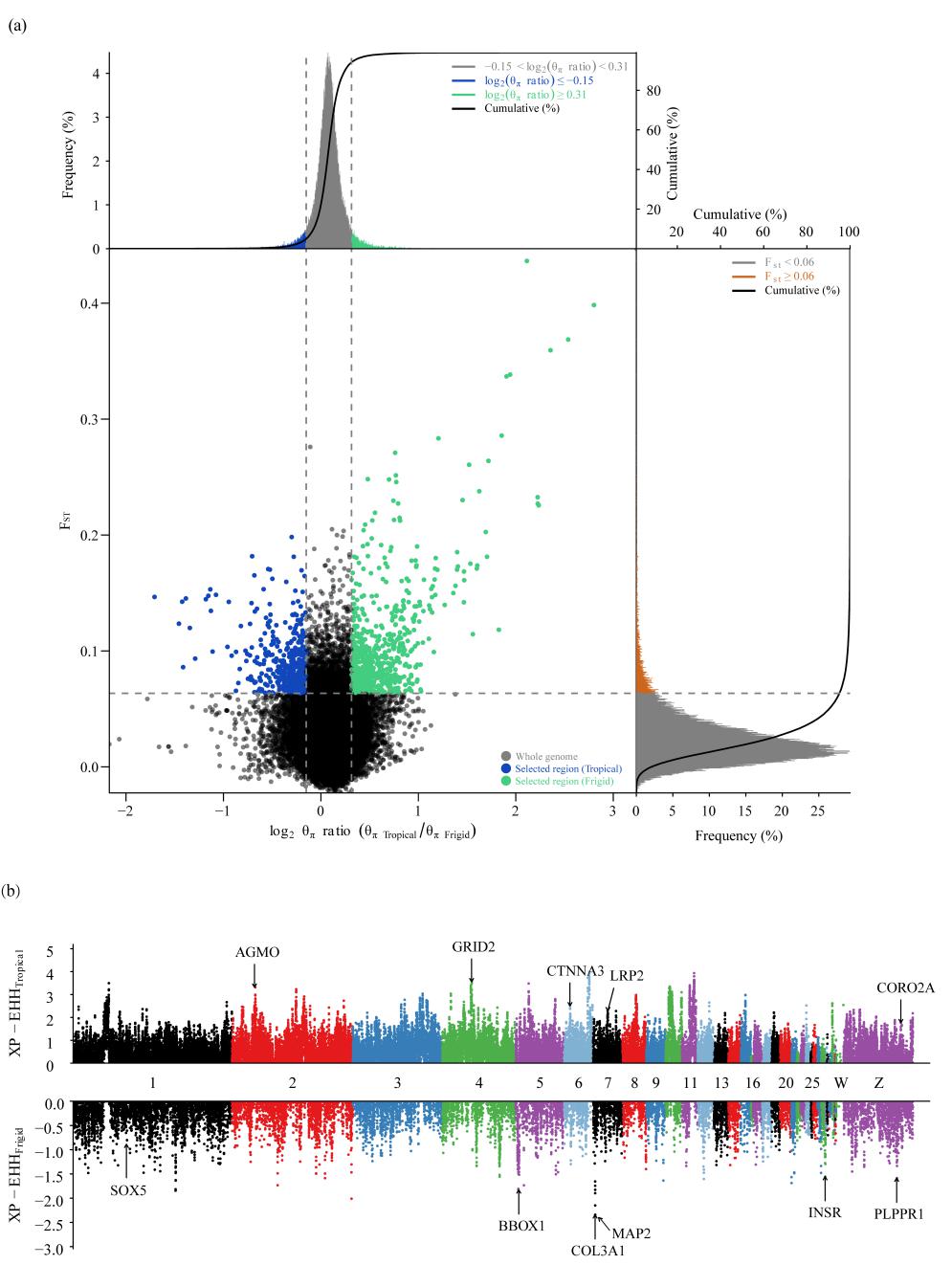 图4. 全基因组统计分析。(A)“热带”组和“寒冷”组中选择信号分析。核酸多样性比值(x轴),Fst分析(y轴);(B)“热带(N=15)”组和“寒冷(N=160)”组环境适应性的XP-EHH值的曼哈顿图分布(前5%离群值)。