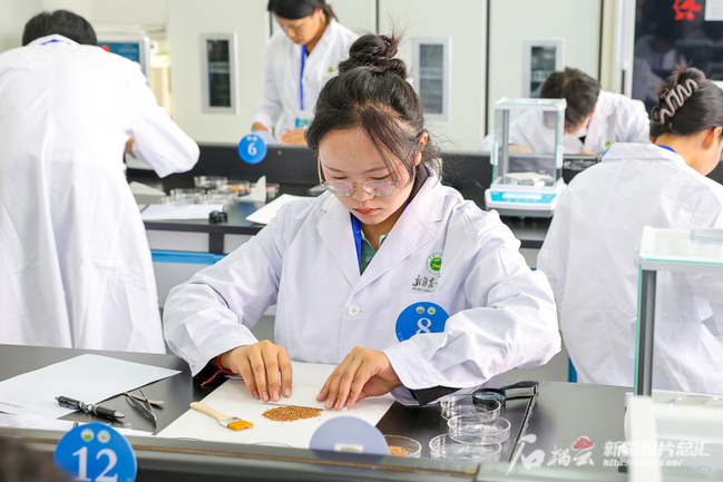 9月21日,选手正在参加草类植物种子识别及净度分析比赛。胡学哲摄