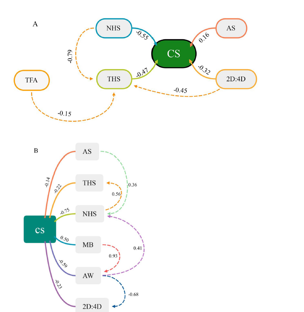 图2基于LASSO回归下路径分析的大耳沙蜥埋沙得分(A未切栉缘;B切除双侧栉缘)